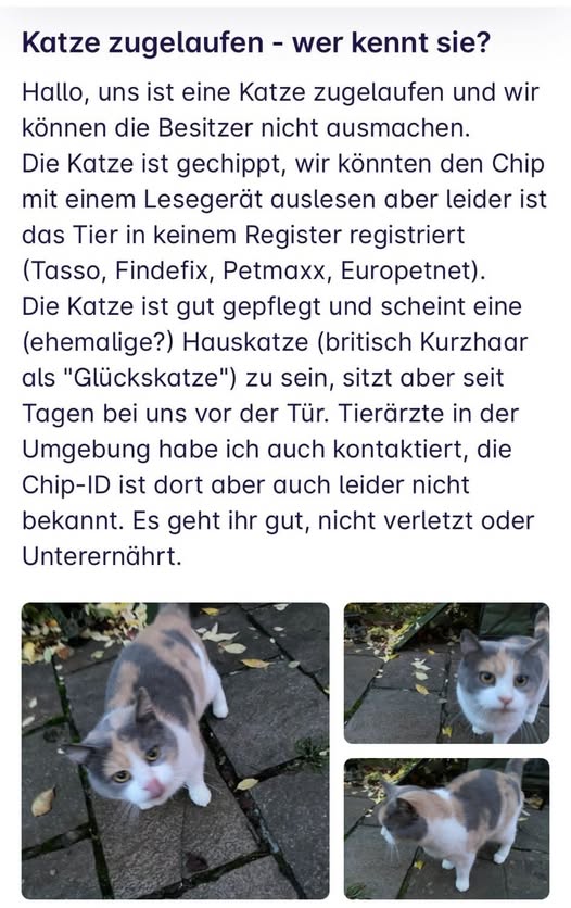 Was zusätzlich noch helfen kann, sind z. B. das Posten einer Fundnachricht auf Facebook, örtliche Tierheime oder Tierschutzvereine kontaktieren – beispielsweise uns – oder das Schalten einer kostenlosen Fundanzeige auf Ebay-Kleinanzeigen. Zudem sollten Sie eine Suchanzeige bei Tasso, Ifta oder dem Deutschen-Haustierregister findefix aufgeben.